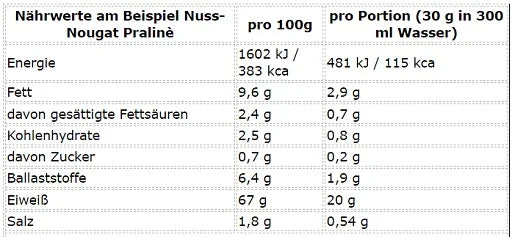 Erbsenproteinisolat 62 %, Kürbiskernproteinpulver (geröstet) 18 %, Sonnenblumenprotein 9 %, Kakaopulver, Aroma, Verdickungsmittel (Xanthan), Süßungsmittel (Sucralose, Acesulfam K).