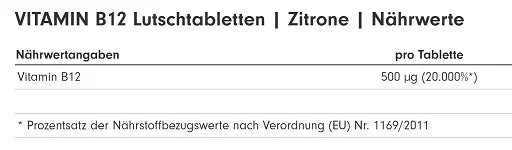 Eine Lutschtablette VITAMIN B12 enthält 500 µg (Mikrogramm) Vitamin B12 aus einer Kombination aus Methylcobalamin, Adenosylcobalamin und Hydroxocobalamin. Statt Zucker oder Dextrose verwenden wir zum Süßen unserer Vitamin B12 Lutschtabletten Xylit, den sogenannten Birkenzucker - ein 100% zuckerfreies Süßungsmittel.